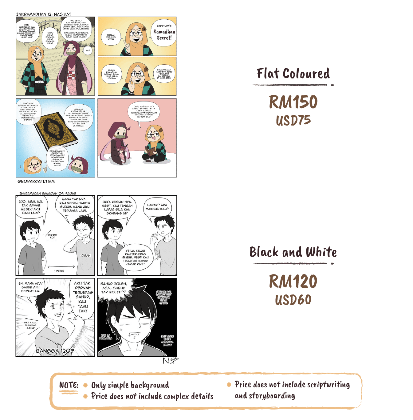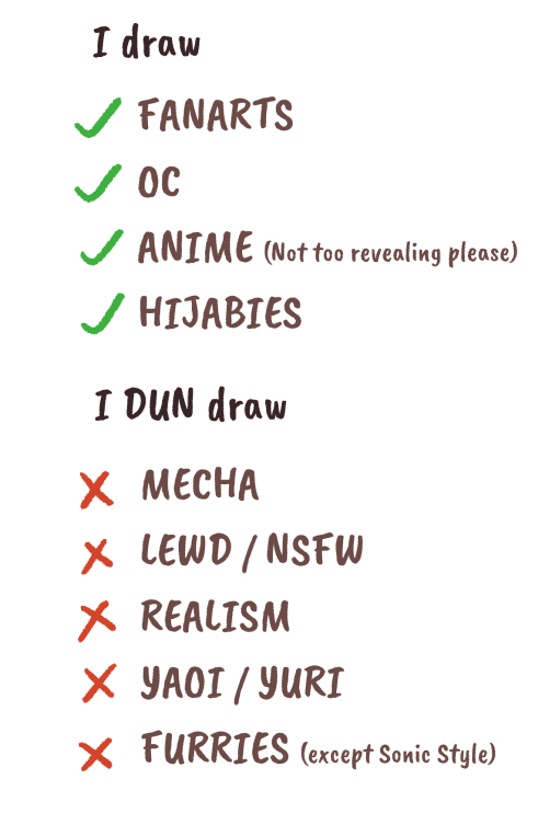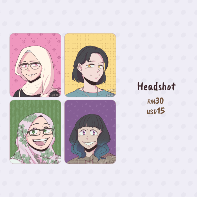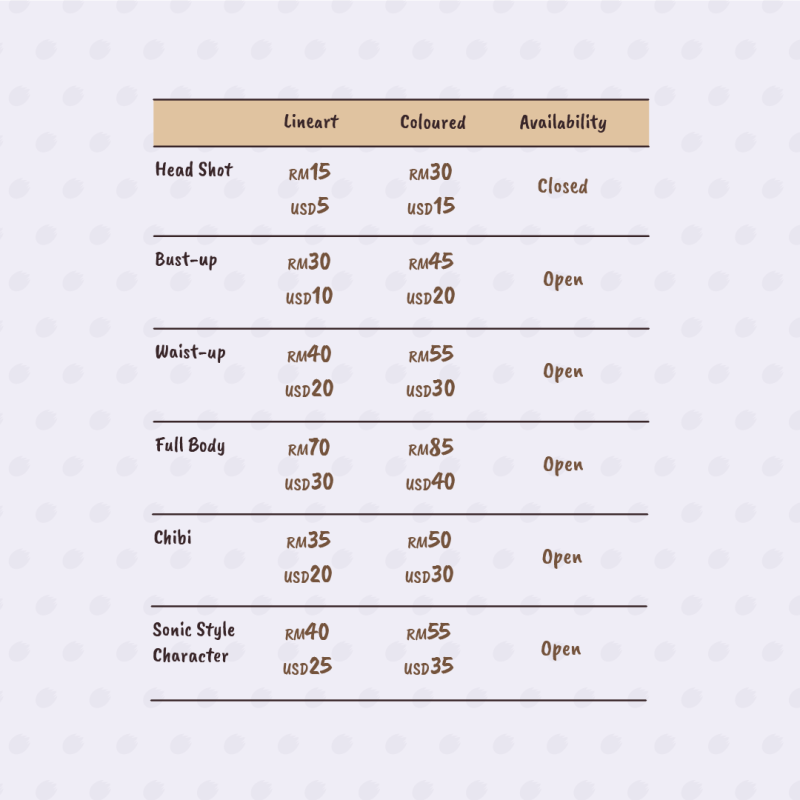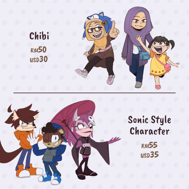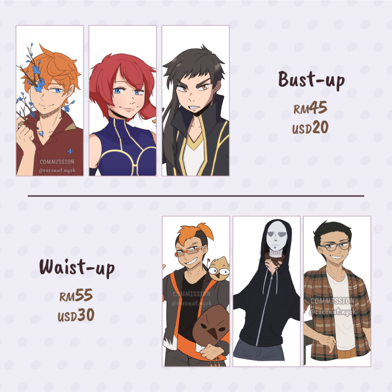 Please send references of the character and their poses that you would like me to draw. Please also send scripts and storyboard (=sketch or rough description of how each panels going to look) if you are commissioning for 4-koma comics.